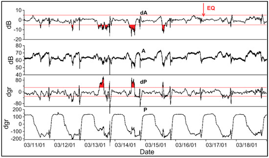 Figure 3 besides the real data, we show the differences or residual signals. For each month, an average background (model) signal is calculated based on data from the ‘quiet days’, and then the residual signals of amplitude and phase (dA and dP) are calculated as the difference between the observed and model signals. The anomalies of the signal in this case were observed 3–4 days before the earthquake.