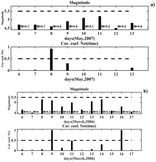 M = 5.5. We saw that the behavior of the coefficient of correlation on 8 May demonstrated a disturbance in the signal. It could be classified as a “false alarm”. Similar results were shown in the time interval from 6–17 March 2006 in