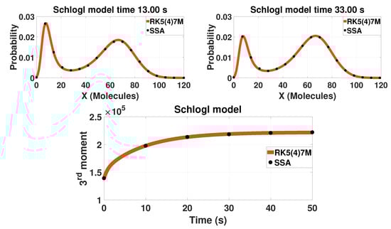 The probability distribution and the third-order moment of the bistable Schlögl model. The first row presents the probability distribution of the single component for two different time points (13 s after the initial condition the left and 33 s the right one). The second row presents the time evolution of the third moment. The solid lines are solutions calculated based on LMEs with tenth-order closure (). The closure order is chosen based on the findings of [29]. The dots represent results from 500,000 SSA trajectories.