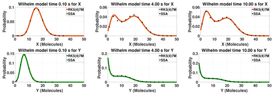 The probability distributions of the multistable Wilhelm’s model. The first row presents results for component X and the second row for component Y. The first column presents the time close to the initial condition (0.1 s), the second a mid-time point (4 s) and the last column a time point close to steady-state (10 s). The solid lines are solutions calculated based on LMEs and the dots/diamonds SSA solutions. The LMEs are calculated with up to sixth-order moments (). The closure order is chosen based on the findings of [39,45]. For SSA, 500,000 trajectories were used.