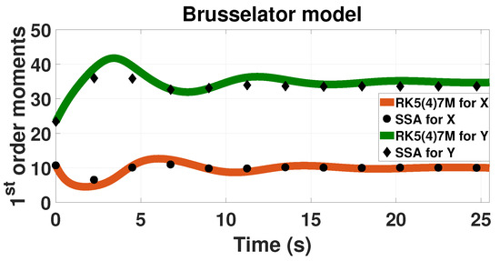 Time evolution of the first-order probability moments for the oscillatory Brusselator model. The solid-line upper green line presents the moment for Y component calculated based on LMEs. The solid-line lower orange line represents the moment for X. SSA results are also included from 500,000 trajectories; dots represent component X and diamonds component Y. The results are calculated with up to fourth-order moments ().