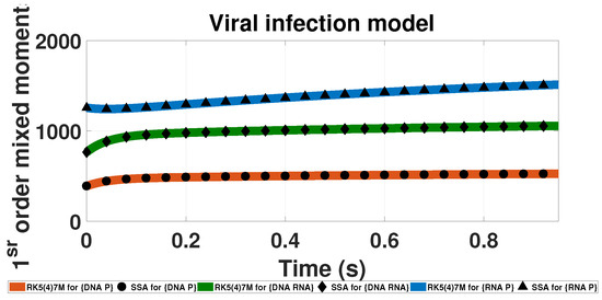 The LMEs approach is only limited to theoretical systems with complex behavior but can also be applied to natural and synthetic biological networks. One example is the viral infection model. The model was first created by Haseltine [37] as a general model of a cell infection by a virus. The model was then revised and simplified by Goutsias [38]. The network in Table 1 reflects the revised version of Goutsias. Results for the mixed first-order moments (moments than depend on more than one component) are reported in Figure 4. The LMEs approach accurately captures the different dynamics of all components and their combinations throughout the entire simulated time (Table 2).