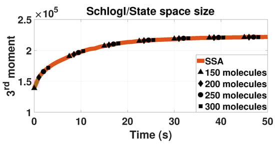 Time evolution of the third-order moment for the Schögl model. The plot is similar to the bottom plot of Figure 1. Here, four different state space lengths are plotted. All the cases have zero as the lower bound of the state space. The coloring in this picture is reverse than the rest of them. The solid orange line is the SSA solution for 500,000 trajectories. The black dots are results with tenth-closure LMEs (). The triangles represent the solution with 150 molecules as the upper bound of the state space, diamonds use 200 molecules limit, circles 250 molecules and the squares 300 molecules.