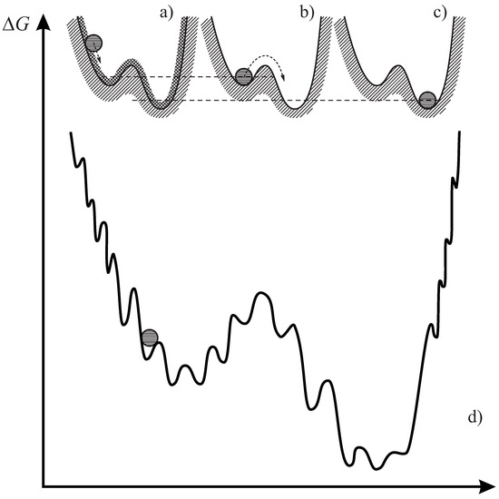 Mechanical analogy for an interpretation of the differences between (a) the glass, (b) the metastable liquid and (c) the stable at crystalline state ( is the melting or liquidus temperature). In this mechanical analogy, the crystalline state corresponds to an absolute minimum of the (thermodynamic) potential well, the under-cooled melt to a higher local minimum. In order to be transferred from the metastable to the stable crystalline state, the system has to overcome a potential barrier denoted in nucleation theory as the work of critical cluster formation. The current state of the glass is represented in this analogy by a ball glued to the wall of the potential well above the minimum (a). Crystallization, if it occurs, is frequently preceded by stabilization processes, i.e., the approach to the metastable equilibrium state of the liquid [4,5,6]. This is commonly taken as granted in the analysis of crystal nucleation in terms of classical nucleation theory [4,7]. The modifications one has to introduce if this is not the case are described in detail in our papers [8,9]. In (d), a modification of Simon’s picture of the vitreous state is given accounting for the potential energy landscape picture of the evolution of glass-forming systems as advanced by Goldstein [10] (see the text).