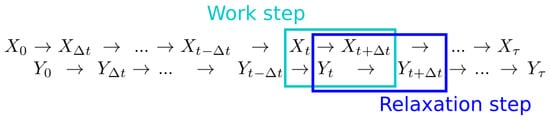 Discrete-time system and environmental dynamics. The system and environment alternate steps, with system evolution during relaxation steps, and environment evolution during work steps.