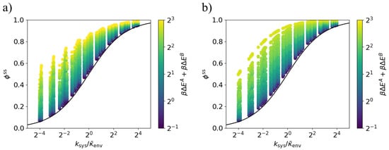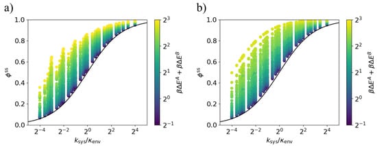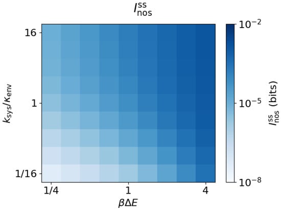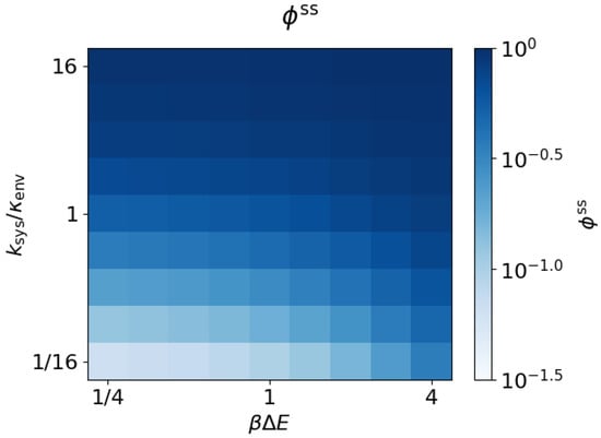 Equations (7) and (8) also apply in this case of arbitrary system rates. Figure 5 shows that across the explored parameter space, the steady-state dissipation ratio lies above the bound (9), with approaching the bound in the weak-driving limit, . We conclude that Equations (9) and (10) apply for arbitrary system rates.