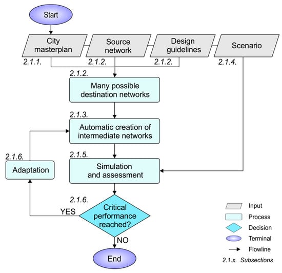 Given a defined goal in the city masterplan, a set of destination networks is created. Thereby parts of the source network and the newly designed “in-silico” WDN parts are combined. The idea is to use the often available future road network (RN) from city planners as the basis for an automatic WDN planning approach. Previous studies proved the high co-location between road and urban infrastructure networks, where about 80% of WDNs are located below 50% of the RN [,]. In the presented model, it is assumed that 100% of the WDN is co-located with the RN (WDN ⊆ RN). However, not all roads may contain pipes; this is mainly due to cost reasons. So there are the two extreme cases of possible “in-silico” WDN topologies; (1) a branched network, representing the minimum spanning tree of the RN, and (2) a highly looped topology, where the WDN layout is identical with the RN. Between these two cases, the loop degree can vary with the cycle index (CI). While a CI of 0 describes a branched layout, a CI > 0 indicates the availability of alternative flow paths (loops) in the WDN, which is also an indicator for reliability and redundancy. More detailed information of the CI can be found in Mair et al. []. During the generation process of the future WDN parts, different CIs are considered. Furthermore, the digital elevation model (DEM), the existing WDN, (future) demand distribution, the position of (future) water sources and the (future) road network are required for model input (see Figure 3). The “in-silico” WDN parts can either represent missing data of existing systems, or possible future network expansions/densifications.