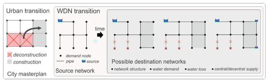 “Network transitioning” describes the pathway from an existing (source) network to a future (destination) network []. Usually transition processes of water infrastructure are relatively slow and take place over decades, where the network structure remains nearly constant (see e.g., Ref. []). Here we present a method and apply it to a case study to assess fast ongoing transitions, with severe impacts on the network’s structure. Changes of the network structure are densifications, expansions and/or disconnection of network parts caused by climate change, population changes, changes in land use, and shifts in water technology [,,]. While new network parts must be designed for expected load conditions and spatial constraints, the existing network may need to be adapted to provide sufficient performances at all times of the transition process. In many cases, the detailed future network layout is largely unknown, because decisions on urban transitions are usually made without taking the water infrastructure into account. In summary, transitioning of urban infrastructure systems is characterized by real world complexity and high uncertainties, which is strongly dependent on the urban development.
