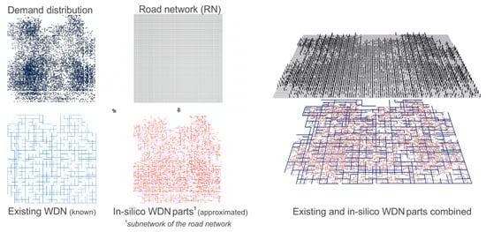 - “In-silico” networks: Unknown WDN parts are approximated with surrogate network data (e.g., roads) and complement known/existing data. This method has great potential in data reconstruction, network disaggregation, and network growth processes, such as network densification and/or expansion. Furthermore, certain links of the co-located network might be excluded in the generation process, so that critical components do not overlay in space (e.g., main pipe underneath main road). Those topics will be part of further investigations.