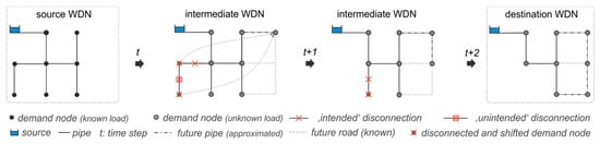 In most cases, changes from an existing system to the final system are long term processes which cannot be directly implemented at one specific time step, but have to be successively introduced in different phases, making the modeling of intermediate transition states unavoidable []. During such a transition process the network’s structure and function changes progressively. Parts of the existing system may be taken out of service, while other parts are connected to the existing system or the demand pattern changes, e.g., due to changing land use. At the same time, the total water consumption and its spatial distribution can change over time. Such stresses can cause a system breakdown, where required performance levels cannot be guaranteed anymore. In our analysis several transition state models, which represent specific time steps during the investigation period, are automatically created (see Figure 4).