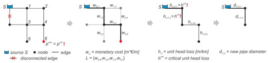 Existing WDNs can tolerate a certain amount of deviations from the optimum planning state to deal with uncertainties (e.g., demand increase, connectivity loss), whilst still guaranteeing sufficient performance requirements (e.g., sufficient pressure). In case the WDN cannot satisfy all requirements local adaptation measures (e.g., pipe replacement) must be considered to improve the performance to a sufficient level. For cost benefits, an effort is made to leave existing components of the WDN unchanged as much as possible. Therefore, we focus on the redesign and replacements of the weakest components by a diameter increase and roughness decrease, in case the minimum pressure threshold value pcrit is not met. To find the weak network components, pipes with unusual high friction loss (user-defined threshold hcrit) are identified and redesigned on a least- “monetary” cost path from the critical node to the supply source. The concept is shown in Figure 5 and subsequently described. The WDN can be mathematically represented as weighted graph G(V, E(W)), which consists of a node set V, an edge set E and a set of values W mapped. Dijkstra’s algorithm [] is used to identify the shortest path L in the network from a critical node (e.g., minimum pressure pmin) to a given root node (e.g., water source S).