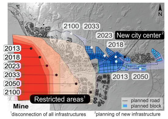 For the city transition of Kiruna, a detailed masterplan for future city development was provided by decision makers. It includes the planned road network and the building blocks of the new center, which is located at the eastern part of the current town. The construction and deconstruction processes are defined by six phases. People living in defined restricted areas have to be relocated to the new city center on a step-by-step basis by the end of the century (see Figure 6).