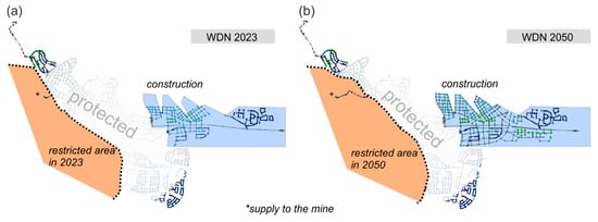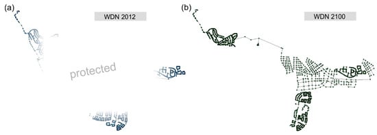 In urban planning, the city masterplan comprises a description of the future city’s spatial and temporal development, defines regulatory changes, and lays out a strategic direction of future visions. Comprehensive objectives regarding urban landscape and water resource development, national and public interests are specified from a municipality perspective and therefore a masterplan is case study specific []. Such a blueprint for the future is the basis for the successful realization of a transition process, out of which various planning alternatives can be derived for further testing and optimization. Furthermore, it decreases the number of uncertainties and makes the modeling process less complex [,]. The masterplan defines, for example, ambitions from centralized to decentralized water management in the future, the disconnection of abandoned city districts due to water quality problems, expected city densifications or expanding neighborhoods, which lead to network growth. In the cases where no masterplan is available, stochastic network growth models such as random or fitness-based attachment models can be used to anticipate network development [].
