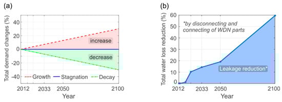 Water demand scenarios over time: (a) Future water consumption, and (b) water loss reduction.