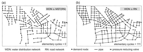 Figure 9 presents two example future WDN layouts. In Figure 9a a branched realization of the WDN to connect all demand nodes (CI = 0) is shown, which represents the minimum spanning tree (MST) of the co-located road network (WDN ≙ MST(RN)). Conversely, Figure 9b presents a highly looped WDN layout, which is identical to the co-located road network and, thus, has more alternative flow possibilities to connect the demand nodes (WDN ≙ RN). The nodal demand is taken from the expected population density map defined in the master plan. Water losses of newly constructed WDN parts are accounted with 10% of the average demand (referred to scenario 1). The position and setting of the pressure reducing valve (PRV) are determined manually on the basis of the topological characteristics of the road network and the topographic boundary conditions to ensure adequate pressure ranges of approximately 50 m in the new city center. The attributes of the PRV are unaltered for every design alternative. The new WDN parts are designed with a pipe sizing algorithm (see Section 2.1.2) and thus have sufficient performances. However, this does not necessarily mean that high performances are established across the entire system, due to integrated older WDN parts and different future demand scenarios. These interactions and possible weak points are investigated in the performance analysis, where intermediate WDN states are also considered.