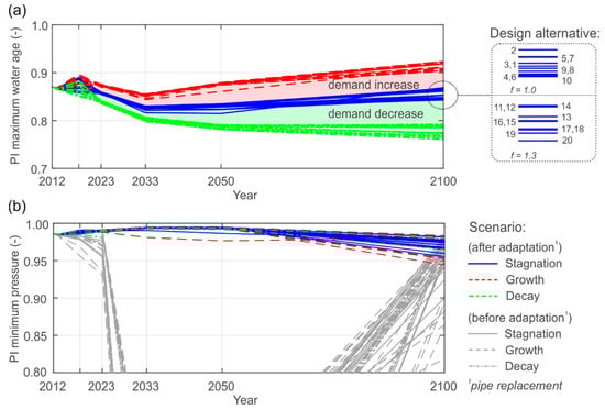 Figure 11b presents the minimum pressure performances with (highlighted) and without (shaded) application of the adaptation concept. It can be seen that until state 2023 the WDN is relatively robust when facing connectivity losses and changed flow patterns. However, after state 2023, the first weak points occur where the system breaks down due to overused pipe capacities, which are mainly caused by the disconnection of pipes. This is noted by the relatively similar performance drops, regardless of the demand scenario. With application of the adaptation concept and the redesign of the weakest pipes, the minimum pressure performances significantly improve to guarantee sufficient hydraulic conditions at peak demand. At final state, higher variations of the PI minimum pressure can be observed, caused by greater demand variations, different WDN topologies and pipe replacement rates (see Figure 12). Owing to the fact the main problems occur in the existing WDN parts, there are also no clear distinctions here between the design alternatives that can be made.