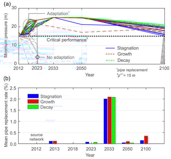 We then take a closer look on the results of the critical performance analysis and the local system adaptation (according to Section 2.1.6). Figure 12a exemplarily presents the local minimum pressure head at the most unfavorable demand node before (shaded) and after system adaptation (highlighted), whereas in Figure 11 global indices were shown. The threshold value pcrit for the critical performance analysis is shown by the bold dotted line in Figure 11. The adaptation concept is performed when pcrit is violated at hourly peak demand. The minimum pressure head in the source network is approximately 17 m. The performance pathways are similar to the global minimum pressure indicator, with the highest variation at the final state. Corresponding pipe replacement rates are demonstrated in Figure 12b, differentiated by the demand scenario. For the growth scenario the highest replacement rates (2.7%) are necessary, whereas they are lowest for the decay scenario (2.2%). However, pipe replacement is necessary for all tested pathways and the differences between the scenarios are relatively low, which indicates that the pipe disconnections represent the main cause of stress for the WDN, especially after the year 2023. One reason for the relatively low adaptation rates is the step-by-step reduction of water losses (see Figure 8b), which provides additional capacities for domestic and industrial water demand. Performed pipe replacements at state t, influence the next future state t+1. This explains, for example, why for the growth scenario in 2023 no pipe upgrades are performed, as they have already been completed at an earlier state. By using this adaptation concept, the latest possible times for pipe replacement are chosen to maintain sufficient performances. The accumulated adaptation rates between 2–3% (corresponds on average to 0.03% per year) of the total network length are low compared to the necessary pipe rehabilitation of approximately 1–2% per year []. The obtained information about the locations of the weakest WDN parts (not shown here for security reasons), the amount, and the latest possible time for necessary pipe replacements, can support decision makers in planning necessary rehabilitation works.