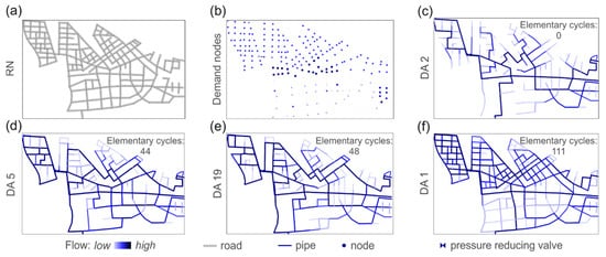 The last planning objective is to identify a reliable and cost-efficient future WDN layout. From the results presented in the previous section, no conclusions about the reliability of the different design alternatives could be made. The design alternatives differ in total network length, pipe diameters and required adaptation works, which all can be associated with costs. For WDN reliability and robustness assessment, the elementary number of loops and the flow entropies are calculated. Figure 13 shows example WDN alternatives for Kiruna’s new city center. Road network (Figure 13a), demand distribution (Figure 13b), and four design alternatives (DAs) with varying network topology and flow distribution are illustrated. Darker links indicate high flows, while brighter links have lower flows.