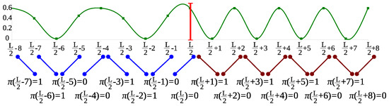 Consider a time series , and its central part is shown in Figure 1. The time series is periodic before and after , but, at , there occurs a change (marked by a vertical line): the “oscillations” become faster. Figure 1 also presents the ordinal patterns of order at times t underlying the time series. Note that there are only two ordinal patterns of order 1: the increasing (coded by 0) and the decreasing (coded by 1). Both ordinal patterns occur with the same frequency before and after the change-point.