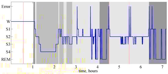 Hypnogram (bold curve) and the results of ordinal-patterns-based discrimination of sleep EEG. Here, the y-axis represents the results of the expert classification: W stands for waking, stages S1, S2 and S3, S4 indicate light and deep sleep, respectively, REM stands for REM sleep and Error—for unclassified samples. Results of ordinal-patterns-based discrimination are represented by the background colour: white colour indicates epochs classified as waking state, light gray—as light sleep, gray—as deep sleep, dark gray—as REM, red colour indicates unclassified segments