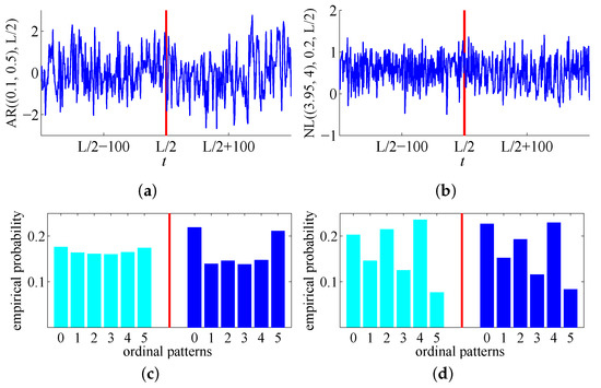 Figure 4b shows a realization of a ‘two-piece’ NL process with a change-point at ; as one can see in Figure 4d, the empirical distributions of ordinal patterns of order before the change-point and after the change-point do not coincide. In general, the distributions of ordinal patterns of order reflect change-points for the NL processes (which can be easily checked).
