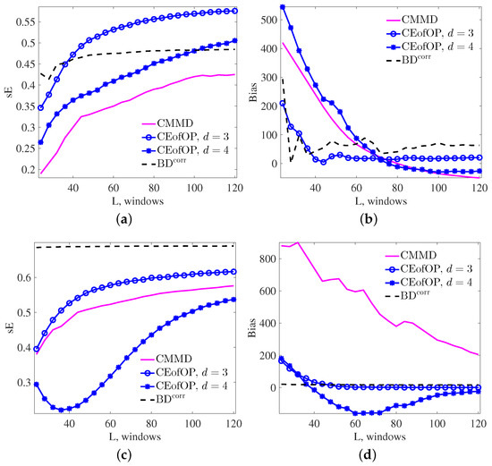 Figure A1 shows how fast that this convergence is. Note that the statistic for orders allows for distinguishing between change and no change in the considered processes for . For , the values of the statistic for order are already very close to its theoretical values, whereas, for , this length does not seem sufficient.