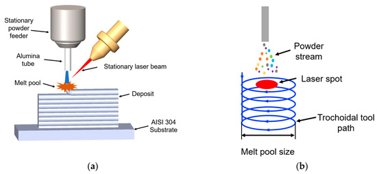 Schematic of the experimental setup, (a) laser metal deposition (LMD) system and (b) the trochoidal tool path.