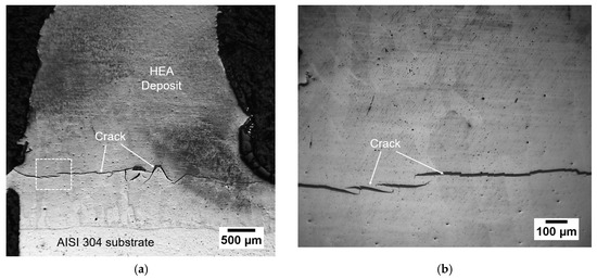 The direct LMD of the AlCoCrFeNi HEA on the AISI 304 substrate will be discussed first. Figure 2a shows a portion of the vertical transverse section of the HEA deposit near the AISI 304 substrate. An area close to the crack zone, as marked in the dashed-line box, is shown in Figure 2b with high magnification. A network of cracks, mostly transverse and horizontal in orientation, were found to be prevalent. Cracking occurred at the bottom of this HEA deposit. This could be attributed to the mismatch between the thermal expansion coefficients. The CTE of this HEA was reported to be 9.03 (10−6/K, 293–303 K) while the value of AISI 304 was 14.7 (10−6/K, 293 K) [18,19].