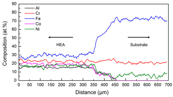 Elemental composition distribution along the interface between the AISI 304 substrate and the HEA deposit.
