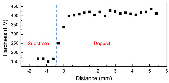The variation in Vickers hardness across the HEA–AISI 304 direct coating is presented in Figure 4. The average Vickers hardness of the HEA deposits was 412 HV, while that of the substrate was 161 HV. Since the coefficients of thermal expansion are mismatched between HEA and the substrate, residual stresses were developed during the laser deposition process. The AISI 304 substrate had a high elongation rate from 28% to 50% in the temperature range of 300–500 °C [23]. However, the tensile elongations of the AlCoCrFeNi HEA were 1% (as-cast condition) and 11.7% (after heat treatment) [4]. A difference in ductility exists between the substrate and the HEA. Having an intermediate material to bridge these differences was deemed necessary.