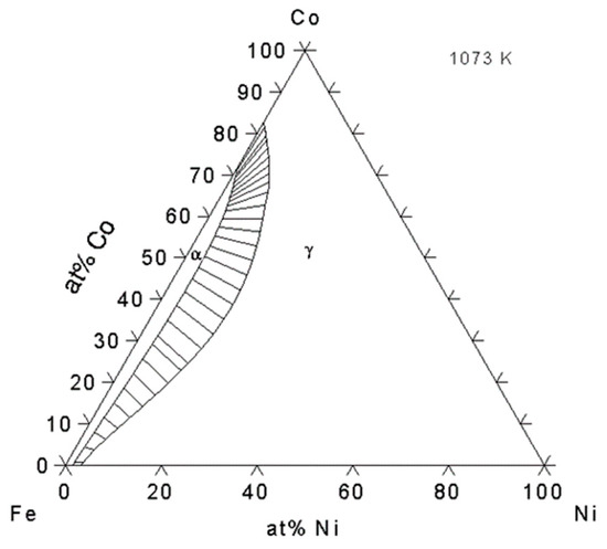 Ternary alloy phase diagram of Fe–Co–Ni at 1073 K [24].