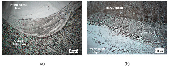 The CoFe2Ni intermediate layer was coated on the AISI 304 substrate using premixed elemental powder. Then, the AlCoCrFeNi HEA was coated on the intermediate layer by LMD. The intermediate layer composition was theorized to avoid the formation of intermetallic compounds and bridge the large gap in strength differences. Figure 6a,b shows the optical images of etched surfaces of transverse sections of these deposits. Unlike the HEA–AISI 304 direct coating, no apparent cracks were observed, which indicated an improvement in bonding. However, issues of microporosity persisted. A dendrite microstructure was observed along the interface between the intermediate layer and the HEA.