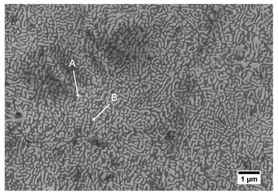 A high-magnification secondary electron image of the AlCoCrFeNi HEA deposit is shown in Figure 7, where a two-phase dendritic microstructure was observed. The area fraction of the dendritic microstructure was ~52%, while the interdendritic area fraction was ~48%. The interdendritic region is named A, and the dendritic region is named B. The mean elemental compositions of A and B (average from three arbitrary points) were analyzed by EDS, and the results are listed in Table 4. It is shown that the atomic percentages of Al and Ni were ~29% in A and ~41% in B. The percentages of Fe and Cr were ~54 atom % in A and 43 atom % in B. These results indicate that Fe and Cr were rich in A, while Al and Ni were rich in B. The composition of Co did not show evident differences between A and B. The mixing enthalpies between Fe–Cr, Fe–Ni, Fe–Co, Fe–Al, Cr–Ni, Cr–Co, Cr–Al, Ni–Co, Ni–Al and Co–Al were −1, −2, −1, −11, −7, −4, −10, 0, −22 and −19 kJ/mol, respectively [6,25]. The mixing enthalpy of Al and Ni was higher than other pairs, which indicated that Al and Ni tended to form atomic pairs and segregate. Similar results have been reported for the AlCoCrFeNi HEA, with this microstructure being attributed to the spinodal decomposition [2,4,5,6,9].