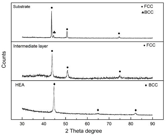 According to the XRD results, the AISI 304 substrate and the CoFe2Ni intermediate layer had an FCC structure, while the AlCoCrFeNi HEA had a BCC structure. The transition from FCC to BCC structure is also expected to enhance the hardness. The high hardness is expected to correlate with good performance in strength and wear resistance [1,16].