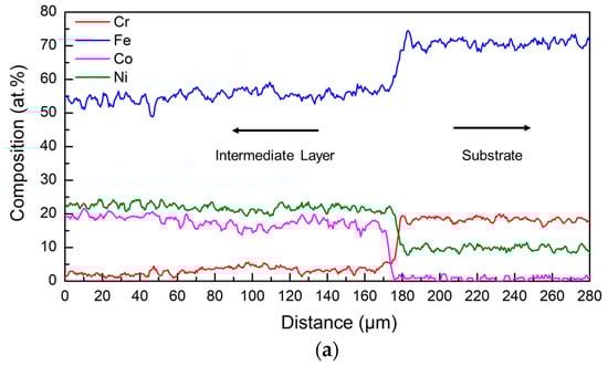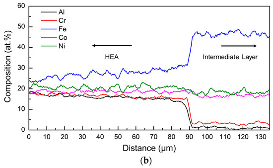 The evolution in chemistry from the intermediate layer to the substrate was characterized by an EDS line scan first. The quantitative results are shown in Figure 9a. The EDS measured results of the AISI 304 substrate (Cr: ~18–19 atom %, Fe: ~70–72 atom %, Ni: ~9–10 atom % in Figure 9a) did not vary from the nominal AISI 304 elemental compositions. Mn (~1–2 atom %) was detected in the AISI 304 substrate by EDS but is not shown in Figure 9. The percentages of Co (~17–22 atom %) and Ni (~21–23 atom %) reduced, while the Fe (~54–56 atom %) content increased from the intermediate layer to the AISI 304 substrate. A small amount of Cr (~3–5 atom %) was present in the intermediate layer, because the substrate was mixed with the intermediate layer. The composition distribution from the HEA to the intermediate layer is shown in Figure 9b. The constituents of the AlCoCrFeNi HEA were detected by EDS (Al: ~16–17 atom %, Co: 19–20 atom %, Cr: ~17 atom %, Fe: ~25 atom %, Ni: ~20–21 atom %). The difference between the as-blended (20 atom %) and as-deposited aluminum (~16–17 atom %) percentages is suspected to be a consequence of inconsistency in capture efficiencies of the constituent powders, and evaporation due to differences in melting point. Al and Cr were present in the intermediate layer as seen in Figure 9b, and their total content was ~4–5 atom %.