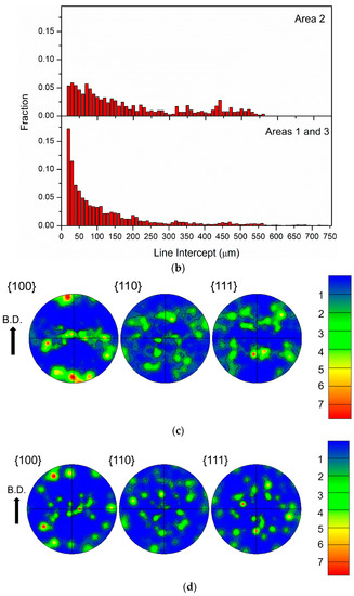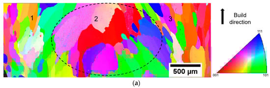 Figure 10a shows the inverse pole figure (IPF) map obtained from the bottom of the HEA section of the specimen. The measured area was approximately 3.4 mm × 1.2 mm of the cross-section parallel to the build direction (BD), which spanned from the left to the right of the specimen. The difference in color indicates the different crystallographic orientations. From Figure 10a, the overall constitution can be classified into two zones—the edge zone (1 and 3) and the middle zone (2). In areas 1 and 3, the grains were observed to be elongated along the build direction (see 1 and 3 in Figure 10a). The distributions of the intercept lengths (using 100 horizontal lines) in different areas are depicted Figure 10b. The median linear intercept for areas 1 and 3 was 72.5 µm, while it was 127.5 µm for area 2. From the linear intercept distribution of area 2, 25% of the intercept values were greater than 300 µm, whereas only 14% of the intercept values were above 300 µm for areas 1 and 3. This grain morphology is likely to be a consequence of deposition toolpath and variation in cooling rate at edges and in the middle [27,28]. Figure 10c,d show the {100}, {110} and {111} pole figures of different areas, which give the distribution of the pole density along the build direction. The pole figure of the areas 1 and 3 (Figure 10c) suggests that the orientations of the grains were close to the <100> direction. However, the grains were random in orientation and did not appear with obvious texture in area 2 (Figure 10d). Further study is necessary to investigate the impact of this toolpath on the grain morphology.