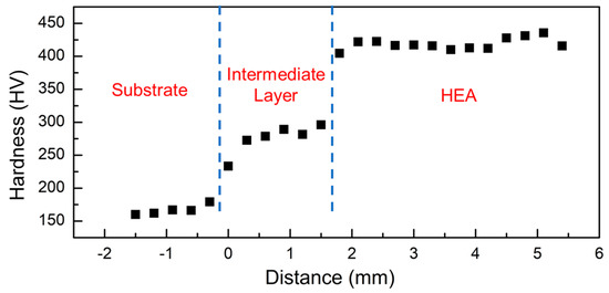 Vickers hardness profile of the AISI 304 substrate—AlCoCrFeNi HEA with the CoFe2Ni intermediate layer.
