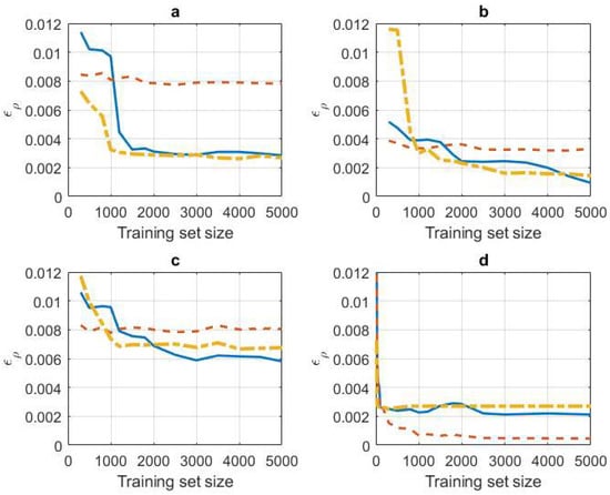 Every curve is an average of 10 curves corresponding to 10 different runs. In every run, an ICA matrix was randomly selected; every entry was obtained by sampling a standard Gaussian pdf. Then, a varying number of training vectors was generated from source vectors having independent components sampled from the mentioned marginal pdfs: sub-Gaussian (Figure 1a), super-Gaussian (Figure 1b), mixed of sub/super-Gaussian (Figure 1c) and Gaussian (Figure 1d). The error was computed as