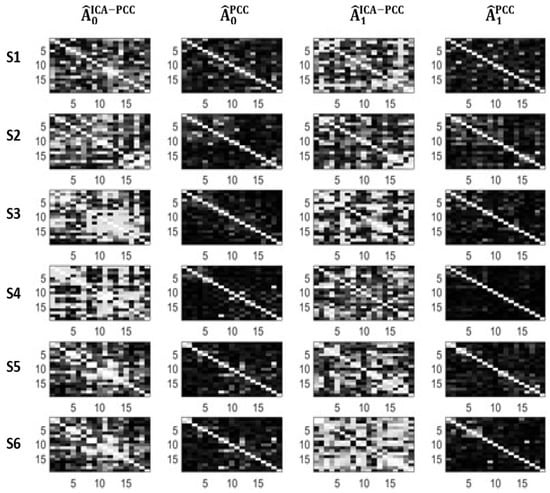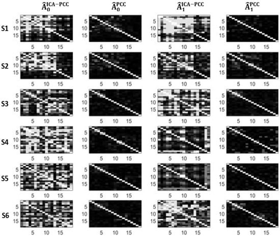 We can see in Table 1 and Table 2 that the PCC method yields very small values of connectivity for all subjects and states, therefore, it is not sensitive to possible changes between states. However, ICA-PCC provides larger values of connectivity and significant changes between states. Figure 2 and Figure 3 show the estimated adjacency matrices corresponding to the different subjects, methods and states. We can see that PCC magnitudes are, in general, much lower than ICA-PCC magnitudes, therefore, PCC has more difficulty revealing the interrelations between the different EEG channels due to the brain activity. This may be explained in terms of the residuals and . Notice from (12) that