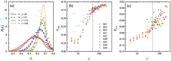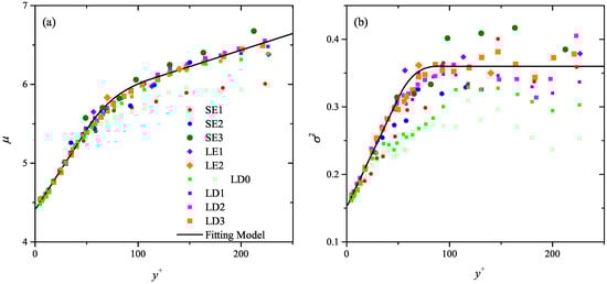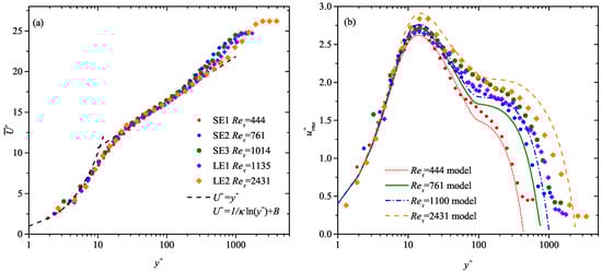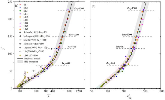 The validity of this empirical model can be evidenced by the following two aspects. Firstly, as shown in Figure 9, and of the SE and LE cases (solid dots), which are not used to construct this model, generally collapse onto the model’s prediction (bold solid lines) till the upper bound of the log layer. Moreover, in the near-wall region reported by most of previous studies [30,72,74,75] (hollow markers in Figure 9a) are also compatible with it. Two exceptions are Nakagawa and Nezu [36] and Lin et al. [76], who reported remarkably smaller beyond = 30. To our regards, this might be related with either the condition invoked in the conditional correlation calculation in Nakagawa and Nezu [36] or the insufficient FOV span ( = 320) in Lin et al. [76]. For the latter, the LD3 case with similar is resampled by = 300, this leads to a reduced (hollow squares with cross markers in Figure 9a) consistent with those in Lin et al. [76].