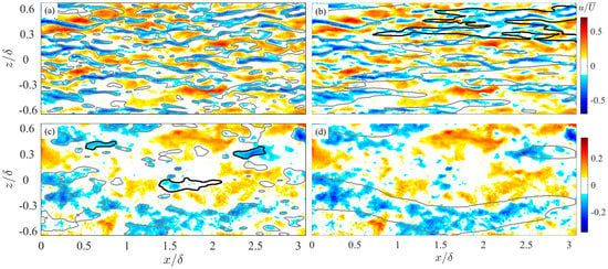 The scale-separated velocity fields are visualized as the isolines of = 0.05 superimposed onto the full-order u field in Figure 2a–d, respectively. In the near-wall region, the footprint of outer-layer LSMs can be visualized as the amalgamation/coordination of several small-scale streaks to a larger one (see the structure highlighted with bold isolines in Figure 2b for example). While in the log layer and above, captures the core regions of LSMs. Small-scale structures independent from LSMs also appear now and then in (as indicated bold isolines in Figure 2c). They have reduced streamwise extent and expanded spanwise scale if compared to the near-wall streaks.