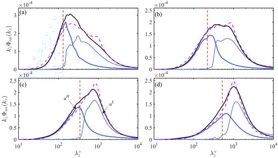 Comparison of premultiplied spanwise spectra of the full-order u fields with of the POD-separated leading- or high-order fields in the LE1 case at (a) ; (b) ; (c) and (d) . in the LD1 case is also given for a comparison. ―: of LE1; — —: of LD1; ―: of LE1 with = 0.5. Vertical dashed lines are the most probable streak spacing predicted by the empirical model in Section 4.2.