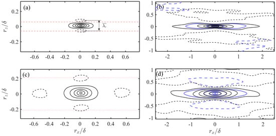 Two-point correlation map of POD-separated fields in the LE1 case with = 0.5. (a) at = 28; (b) at = 28; (c) at = 226; (d) at = 226. Thin solid/dashed isolines represent positive/negative correlation with contour level uniformly spaced from −0.1 to 0.9 with a gap of 0.2. of the full-order u fields are superimposed in (b,d) as bold solid/dashed isolines. The interval between the horizontal thin dashed lines in (a,c) indicates the most probable streak spacing predicted by the empirical model in Section 4.2.