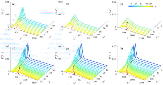 Wall-normal variation of the PDF of the streak spacing . (a) SE1; (b) SE2; (c) SE3; (d) LD1; (e) LD2; (f) LD3. The local maxima of the probability density function (PDF) are projected on the - plane as solid dots.