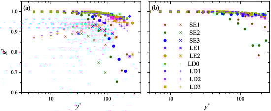 Wall-normal variation of the determination coefficient in all the studied cases. (a) of both the log-normal fitting via Equation (3) (solid circular, diamond, or rectangle) and the Rayleigh fitting via Equation (4) (diagonal cross, star, and cross); (b) of the dimensional constraint log-normal fitting via Equation (5).