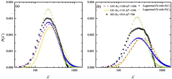 Figure 5 gives an overview of the wall-normal variation of the PDF of inner-scaled streak spacing in the SE and LD cases. Every PDF profile presents a single peak without a sign of bi-modal pattern even in the upper bound of the log layer. The long tail of extends towards the large value side to form a left-skewed shape. The most probable streak spacing increases monotonically with , while decreases, in together with a distinct growth of the long tail. However, a so-called ‘truncation effect’ is observed in higher layers of the SE cases: due to the limited FOV span ( = 500∼700), those events with potentially large are not detected, making a remarkable shortening of the long tails of if compared to those in the LD cases. Note that truncation effect has been inferred by Smith and Metzler [30] as ‘This result (biased streak spacing) was felt to be a consequence of the narrowness of the data window’. A detailed inspection of all the profiles shows that for the LE and LD cases whose FOV span = 1500 is rather large, the truncation effect is minor; while for the LE cases, once is far from , the truncation of the long tail part of will not bias the value of but change the overall probability level.