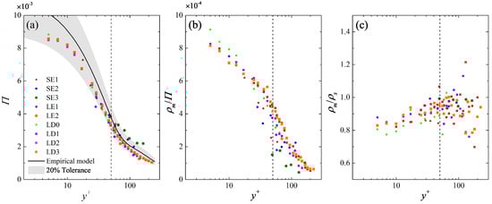Wall-normal variation of (a) and (b) till the upper bound of log layer. Solid markers are the estimations by Equation (5) in all the studied cases. Only the data below the upper bound of the log layer, i.e., indicated as dashed horizontal lines for typical in (a), is shown. The same in Figure 10 and Figure 11. Hollow markers in (a) are obtained by previous studies listed in Table 1. Hollow squares with cross markers indicate the truncated LD3 case with = 300. Bold solid curves are predictions of the empirical model of Equations (6)∼(8), with shaded regions indicating a ±15% tolerance.
