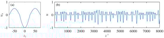 In this model, is the phase angle at ; , which is actually a periods of cosinusoid modulated by a box function, represents a spanwise profile of one single low-speed streak centering at = 0; sets the wavelength of the streak; is the nominal streak amplitude and returns the sign of . Figure 12a shows a typical streak unit with and = 1. For a given , multiple streak units whose are randomly generated via the empirical streak spacing model of Equations (3), (7), and (8) are successively added along the spanwise direction till the whole span is full, i.e.,