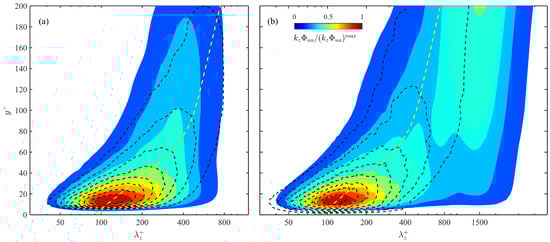 Comparison of the premultiplied spanwise spectra simulated by the simplified synthetic method (dashed isolines) with the original one (pseudo-color maps) in (a) the LD0 case and (b) the LD3 case. are all normalized by the maximum value in the near-wall region, and the contour labels are evenly spaced from 0.2 to 0.9 with interval of 0.1. Dashed lines are predicted by the empirical model in Section 4.2.