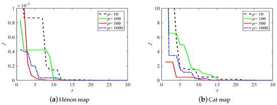 The identification results for the Hénon map and the Cat map are shown in Table 2. The APSO algorithm had the highest precision among the ABC, BSA, DE, and PSO algorithms, but it returned larger J values than the other four kinds of the IPSO algorithm. Therefore, this demonstrates that the IPSO algorithm had better performance than other five optimization algorithms. Furthermore, the identification precision of IPSO can be increased by increasing p. The IPSO algorithm performed optimally with . The evolution of J obtained by IPSO with different p is shown in Figure 4. When , J converged to the objective value after about seven iterations in the Hénon map and twelve iterations in the Cat map, respectively. Therefore, the IPSO () had the fastest convergence rate of the algorithms. Therefore, may be a good choice.